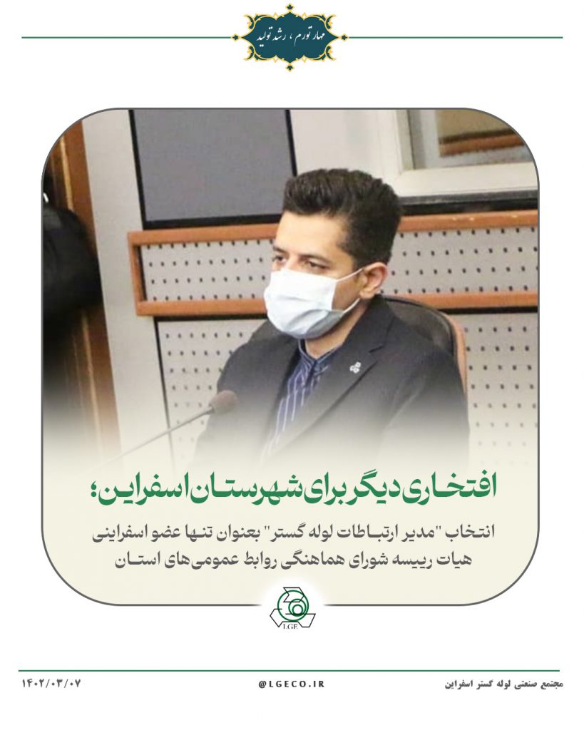 در مجمع انتخابات شورای هماهنگی روابط عمومیهای استان که در حاشیه همایش ارتباطات و روابط عمومیها و با حضور تمامی مسئولان و مدیران کل دستگاههای اجرایی استان برگزار گردید ” محمدعرفان زارعی” مدیر ارتباطات و تشریفات لوله گستر به عنوان عضو هیات رئیسه شورای روابط عمومیهای استان از شهرستان اسفراین انتخاب شد؛ این در حالی است که سایر اعضای این هیات رئیسه از مرکز استان بودند.